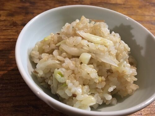 みょうが(茎みょうがだけど普通のみょうがでも)適当に切って、好みの味をつけ(塩と梅酢)、好みの油分(うど油)もまわしておく。お米がたきあがったらのせて蒸らす。 お米は、50度のお湯に洗った玄米をトポンと入れてから43度くらいまでに調整したぬ…