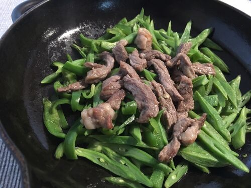 ステーキ用牛さんは細切り。美味しそうな牛さんだったので塩のみをちょっと強めにふっておく。インゲンとピーマンも細切り。 スキレットに油をしいて、牛さんを入れて、野菜を上からかぶせて牛さんを蒸し焼き。しばらくしたら、牛さんを取り出して野菜の上に…